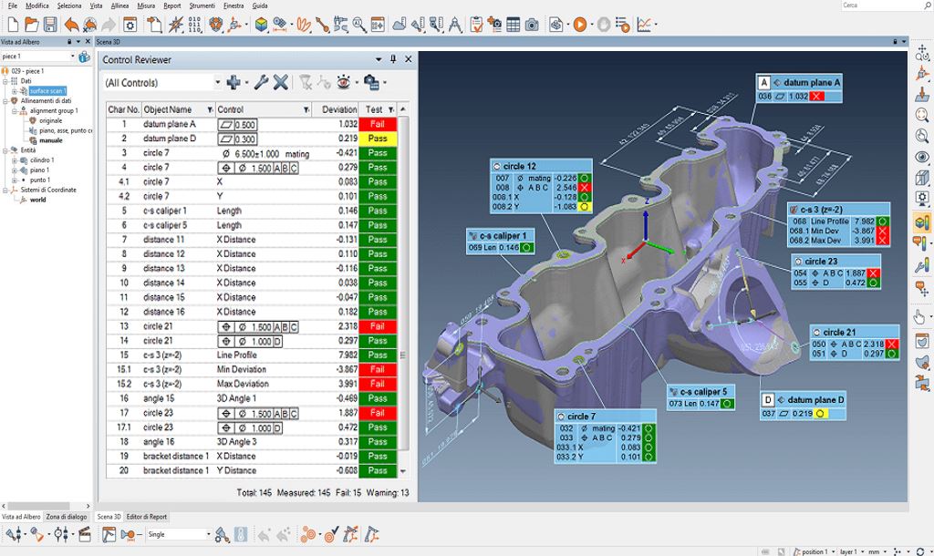 3D scanning or probing, superimposed on the ideal design model, allows the evaluation of geometric deformations. Often the quality control ends only after the identification of the possible cause of the defect. Reports are used to track identified defects over time and evaluate the improvement or worsening of a production process.
